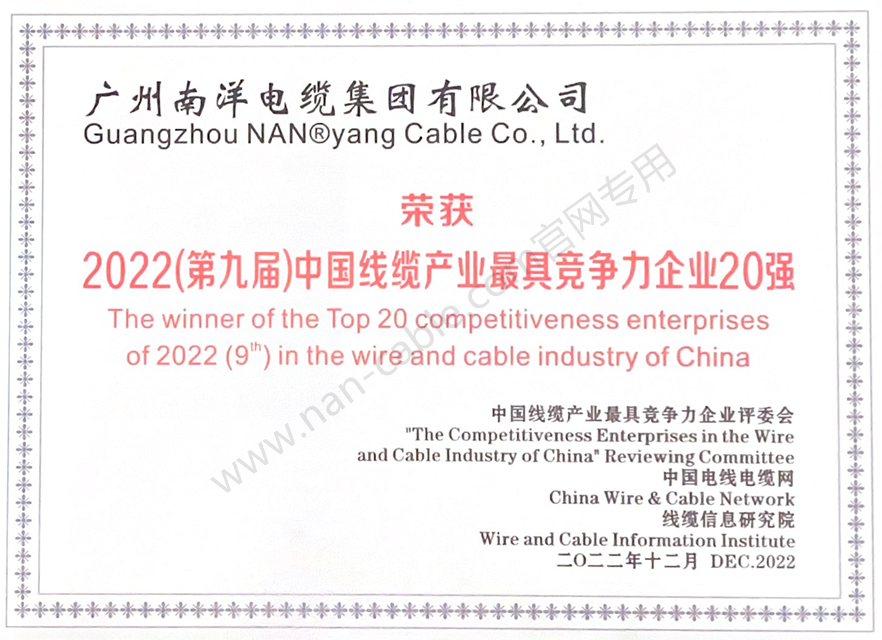 • 2022年度中國線纜行業最具競爭力企業20強證書